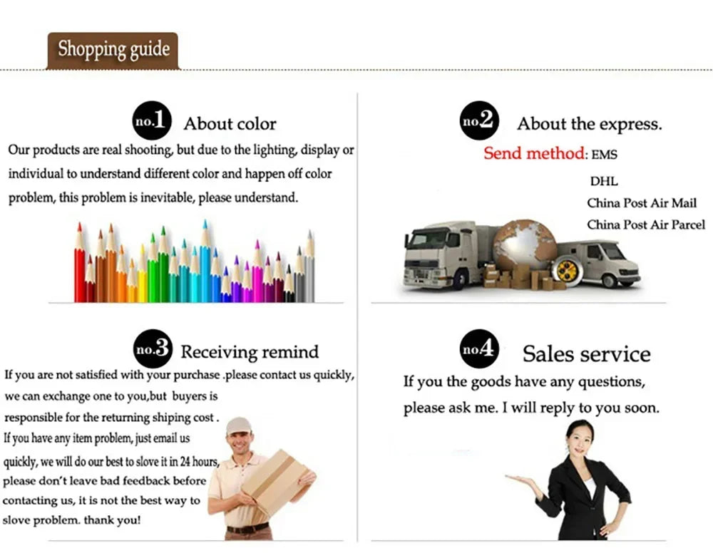 2. Dacă produsele pe care le-ați primit au fost deteriorate sau stiluri greșite, vă rugăm să nu lăsați niciun feedback negativ mai întâi, vă rugăm să ne contactați, ne vom ocupa de ea și să lucreze cele mai bune soluții, Satisficia ta este moțiunea noastră de a face mai bine.